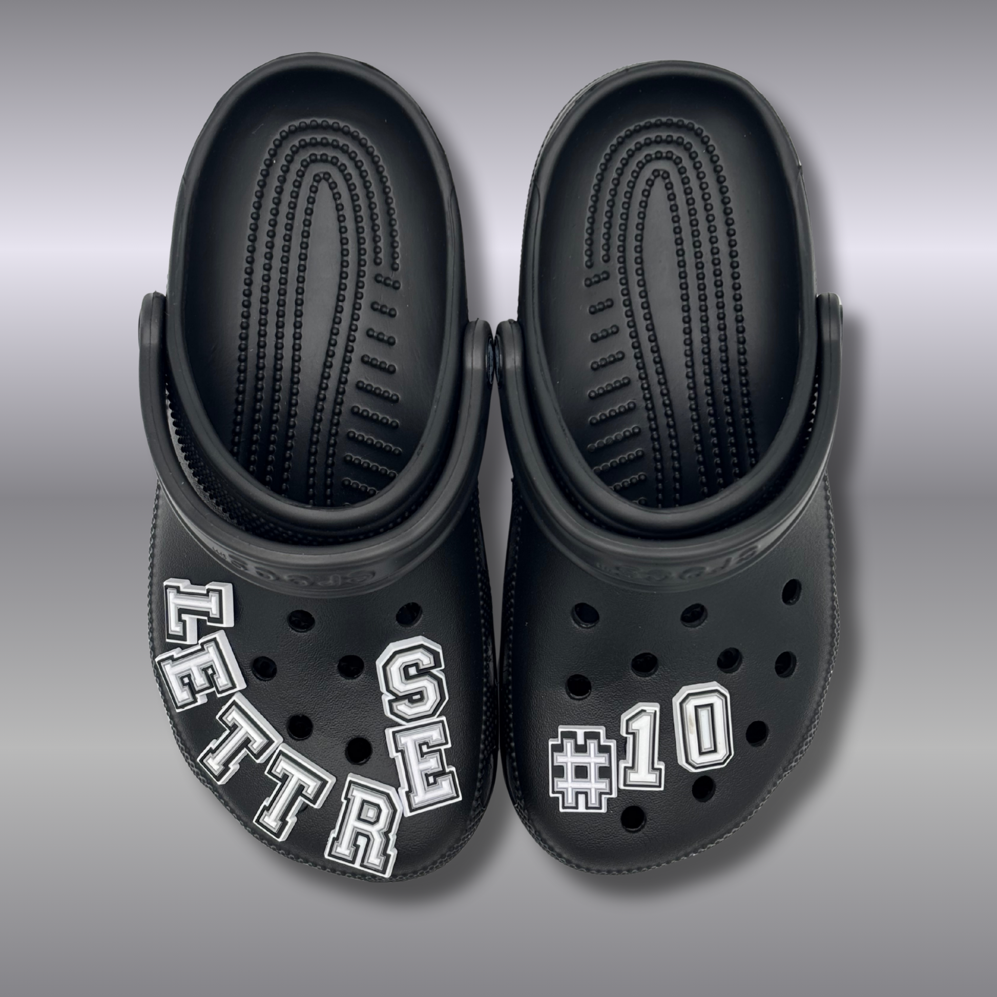 Personalize your pair 100% with this unique custom clog set. The set includes the clogs and 10 pins of your choice from letters and numbers. Create your nickname, a stylish word, or your lucky number and design a pair that's truly uniquely yours.